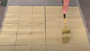 Postaw garnek na ogniu i zagotuj mieszaninę, ciągle mieszając. Następnie zdejmij mieszaninę z ognia i przenieś ją na talerz. Przykryj go folią spożywczą i pozostaw do całkowitego ostygnięcia. Rozwałkuj ciasto francuskie i przekrój je na pół. Jedną część pokroić na 15 kawałków, a drugą połowę ciasta nakłuć kilkakrotnie widelcem.