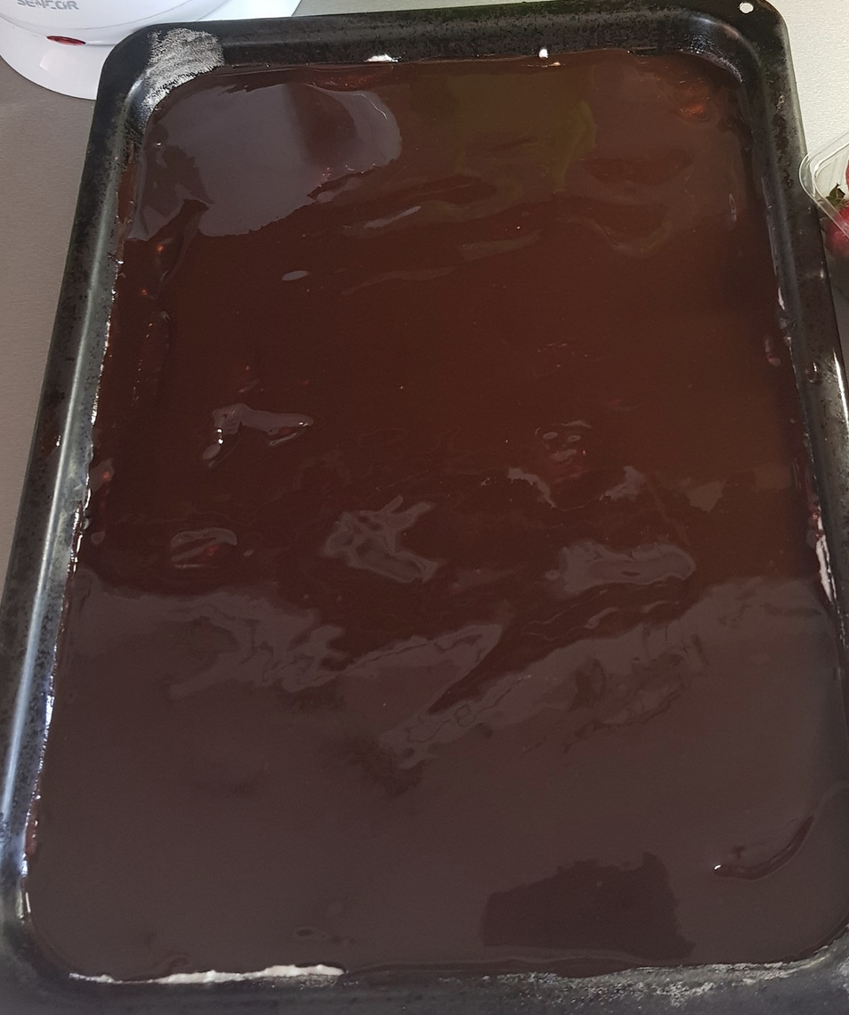 Polewa: Podgrzej śmietankę na ogniu. Czekoladę połamać i dodać do śmietany, mieszając. Jeśli chcesz, możesz przyspieszyć cały proces w kuchence mikrofalowej. Polej polewą czekoladową. Niech stwardnieje i możesz podawać.