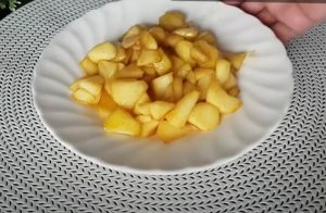 Jabłko obrać, usunąć rdzeń, pokroić w ósemki i pokroić w grubsze plastry. Umieść je na patelni, dodaj cukier, trochę cynamonu i masło. Zacznij smażyć je na niższym ogniu, aż masa zacznie się lekko karmelizować. Następnie wyłącz ogień i pozwól mu ostygnąć na talerzu.