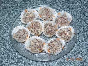 Miękkie masło utrzyj z cukrem pudrem, dodaj zmielone orzechy, kakao, rum i pokruszone herbatniki. Z masy formujemy kulki, które następnie obtaczamy w wiórkach kokosowych.