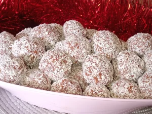 Miękkie masło utrzyj z cukrem pudrem, dodaj zmielone orzechy, kakao, rum i pokruszone herbatniki. Z masy formujemy kulki, które następnie obtaczamy w wiórkach kokosowych.