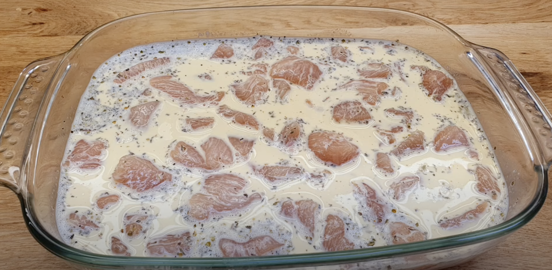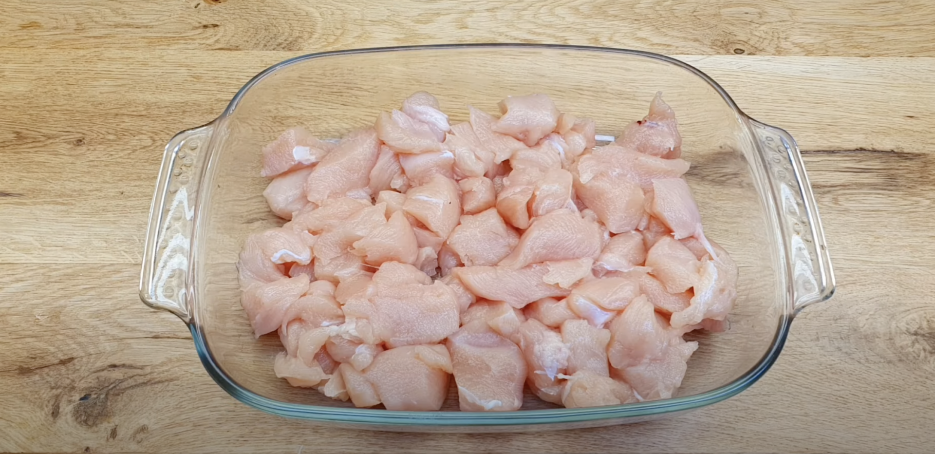 Na początku należy umyć, osuszyć i pokroić w kostkę pierś z kurczaka. Następnie należy dodać do mięsa sól i wszystko dokładnie wymieszać rękami.