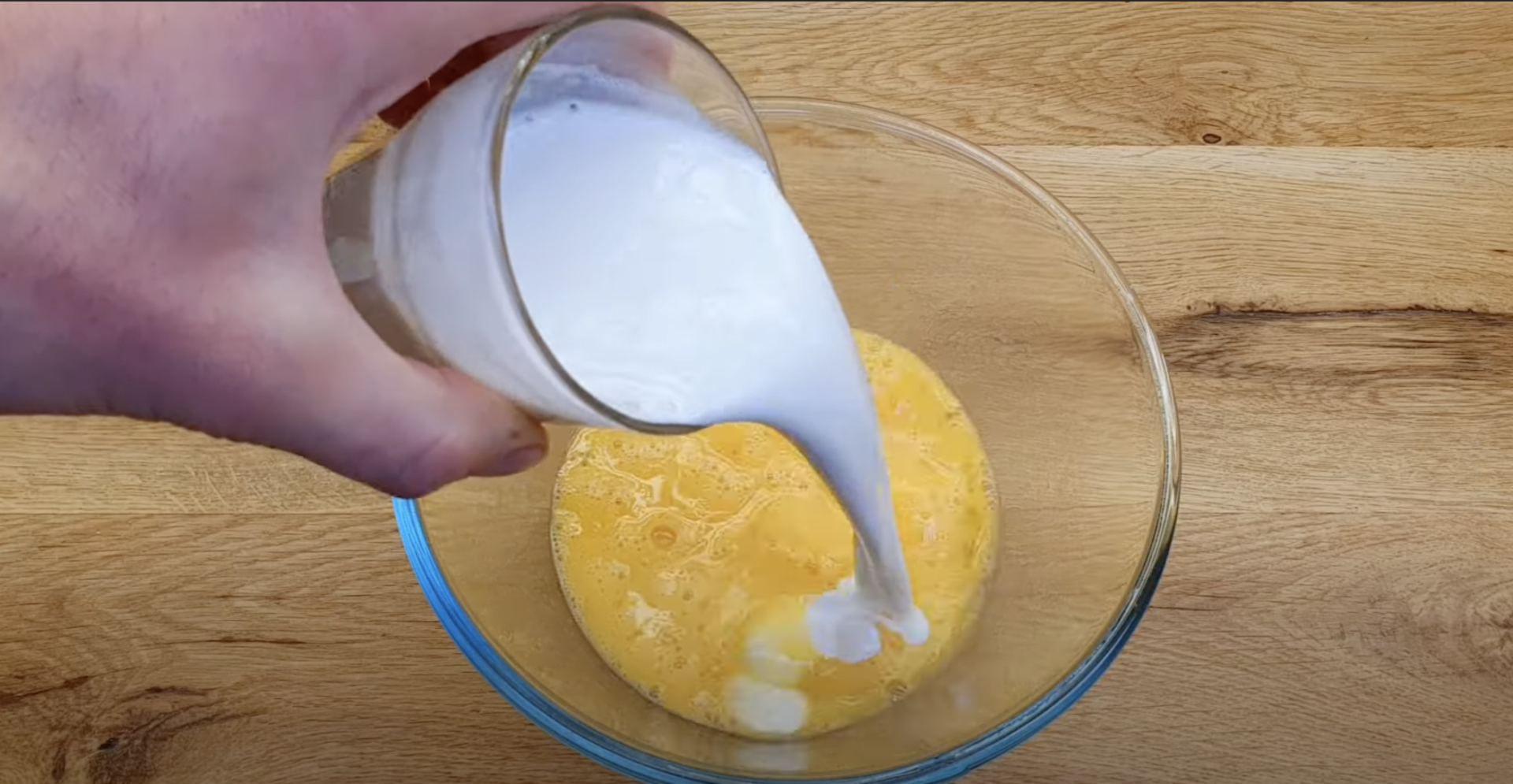 Jajka należy wbić do miski. Dodać do nich śmietanę oraz przyprawy.