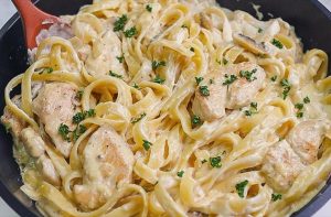 Podczas przygotowywania sosu włóż fettuccine do takiej ilości osolonej wody, aby się ugotowała. Gdy będą miękkie, odcedzamy je, dodajemy do sosu i mięsa, mieszamy. Podczas serwowania posyp je posiekaną natką pietruszki.