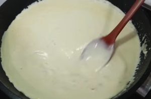 Rozpuść masło na patelni i podsmaż cebulę pokrojoną w drobną kostkę. Gdy staną się szkliste, dodaj pokrojone pieczarki i poczekaj, aż się usmażą. Następnie dodać przeciśnięty przez praskę czosnek, krótko podsmażyć, dodać śmietankę i mleko, na koniec posypać parmezanem. Gotować, często mieszając, aż sos zgęstnieje. Usmażonego kurczaka wkładamy do sosu i doprawiamy solą i pieprzem do smaku.