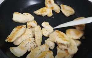 Pierś z kurczaka pokroić na mniejsze kawałki, posolić i popieprzyć z obu stron. Smaż je na patelni z odrobiną oliwy z oliwek, aż będą dobrze ugotowane. Następnie wyjmij je i przechowuj na później.