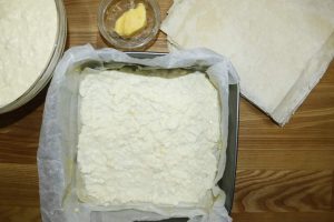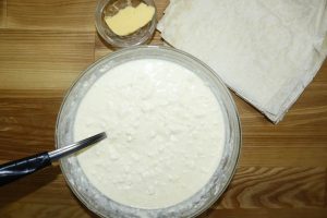 Na ostatnim kawałku lawasza, kwaśną śmietanę, mleczko albo kefir nałóż. Piekarnik do 180°C rozgrzej, a potem piecz przez 35 do 45 minut.