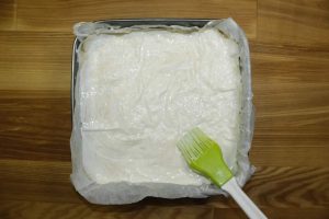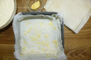 Formę wyłóż papierem do pieczenia, a następnie ułóż pierwszy kawałek lawasza.