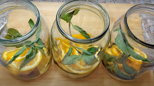 Do każdego pojemnika dodaj kilka plasterków pomarańczy i gałązkę mięty.