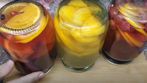 Pomarańczę umyj, przekrój na pół i pokrój w plasterki. Umyj, obierz w razie potrzeby, wyjmij pestki i pokrój wybrane owoce na mniejsze kawałki. Ułóż każdy rodzaj owoców oddzielnie w słoiku.