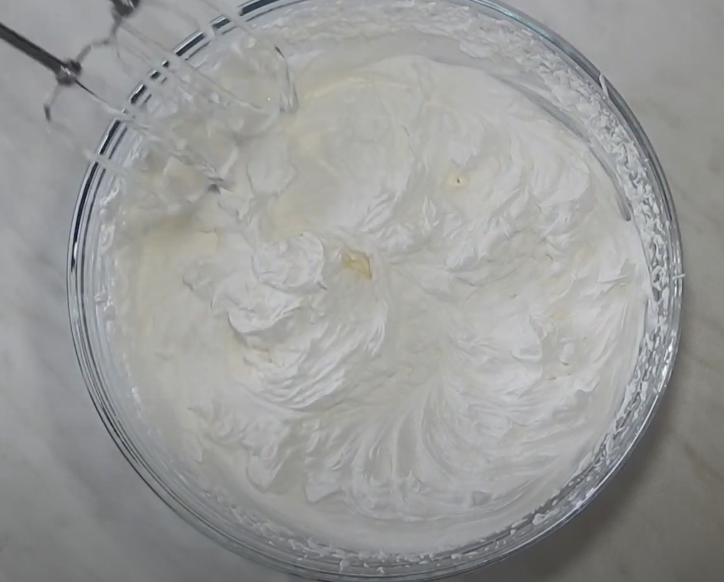 Ostatnim składnikiem jest bita śmietana. Klasycznie ubijamy. Nie słodzę, ale jeśli lubisz słodsze, możesz dodać cukier podczas ubijania. Na owoce kładziemy bitą śmietanę, wygładzamy.