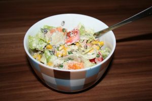 Do niego wrzucamy pokrojone wcześniej łodygi, przykrywamy garnek i gotujemy je. W tym czasie możemy zająć się przygotowaniem pozostałych składników w misce. Do miski dodaj pokrojony w kostkę pomidor, sałatę lodową w mniejszych kawałkach, a także kukurydzę z puszki oraz wcześniej ugotowane na twardo jajka.