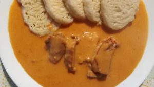 Przyprawione pieczone mięso zalać bulionem i delikatnie dusić. Następnie wyjąć mięso i pokroić w kostkę. Ciasto zagęścić mąką roztrzepaną z mlekiem. Upewnij się, że mąka jest dobrze wymieszana, aby nie pozostały grudki w sosie.