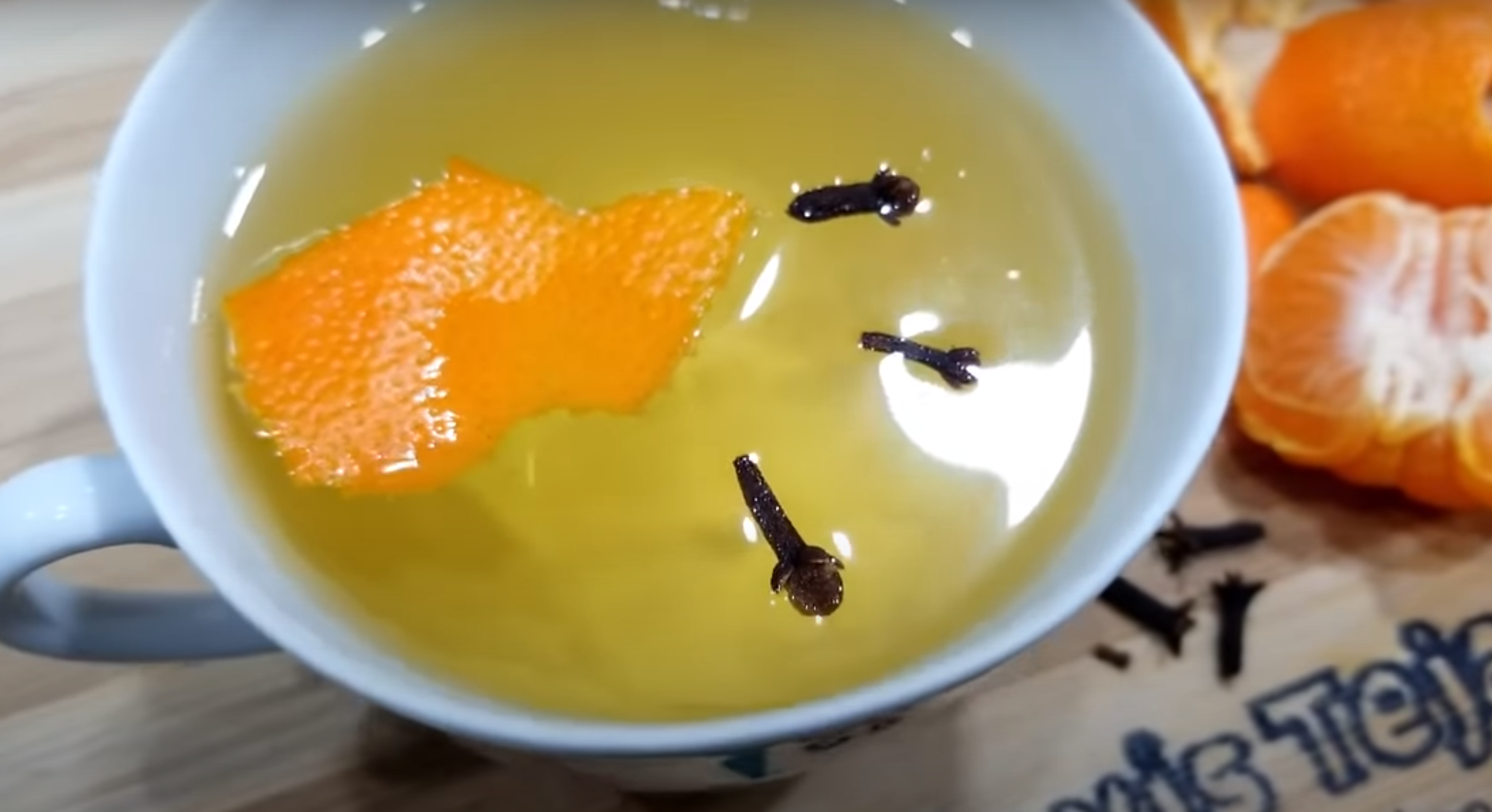 Dokładnie umyj skórkę z mandarynki. Wlej szklankę wody do garnka i pozwól mu się zagotować. Następnie dodaj skórki, 3 goździki i gotuj przez 2-3 minuty. Możesz też dodać do smaku laskę cynamonu. Przecedź napój przez sitko i wypij przed snem.