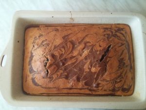 Wlać jasne, a następnie ciemne ciasto. Można też zrobić to odwrotnie i po drodze robić wzory wykałaczką, wybór należy do Ciebie. Piec w piekarniku nagrzanym do 150-170°C przez około 40 minut (w zależności od rodzaju piekarnika).