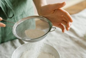 Żółtka wymieszaj z cukrem pudrem i wanilią. Dodaj letnią wodę. Mąkę wymieszać z proszkiem do pieczenia.