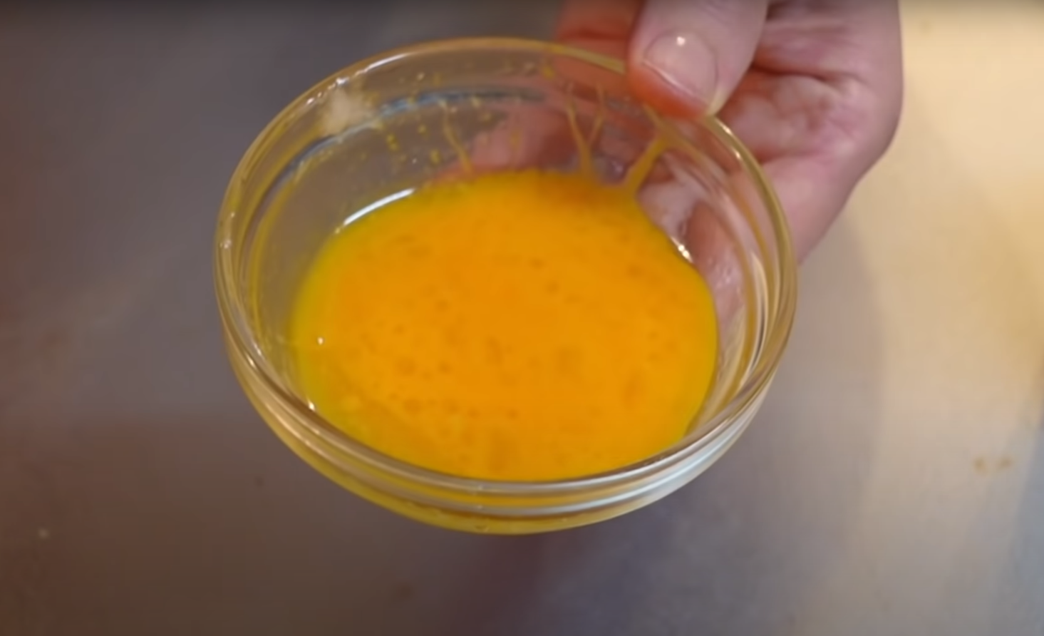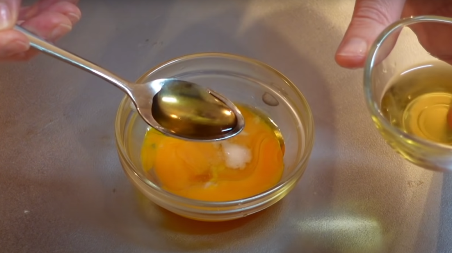Oddziel żółtko od białka. Następnie przełóż żółtko do miski, dodaj pozostałe składniki i dobrze wymieszaj. Na sam koniec dodaj rumianek.