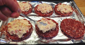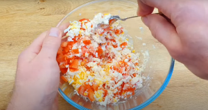 Na początku przełóż mięso mielone do głębokiej miski i dokładnie wymieszaj z wszystkimi przyprawami. Ugotowane na twardo jajka zetrzyj na tarce o grubych oczkach, tak samo uczyń z serem. Pomidora pokrój na niewielkie kawałki.