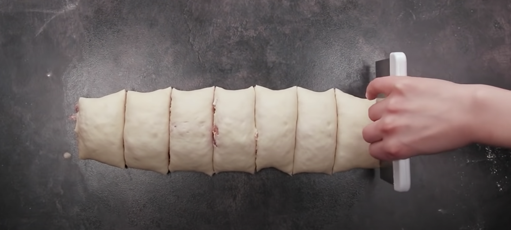 Ciasto zwijamy i kroimy w paski.