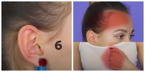 pod kątem w dolnej części małżowiny usznej, nieco powyżej płatka ucha oddziałuje pozytywnie na zatoki oraz pomaga w zwalczaniu bólu gardła.
