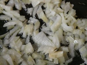 Dodaj sól, przykryj pokrywką i gotuj przez 10-12 minut. Na patelni rozgrzewamy oliwę i dodajemy pokrojoną w kostkę cebulę.