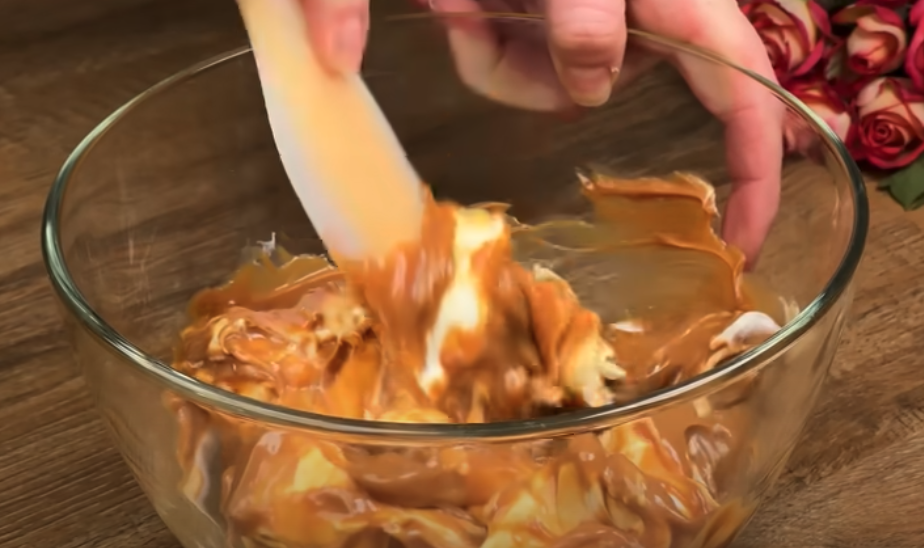 • W misce wymieszaj 5 łyżek serka śmietankowego z 3 łyżkami gotowanego skondensowanego mleka.