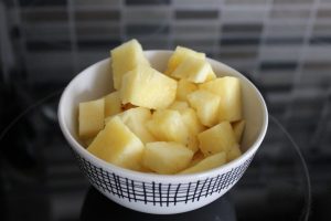 Gruszkę pokrój po usunięciu pestek. Kiwi również przygotuj i dodaj do miksera.