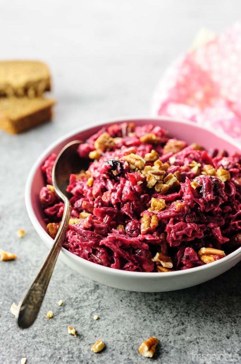 Zalej orzechy na chwilę gorącą wodą, aby nie były suche. Pokrój buraki na kawałki, pokrój śliwki i wymieszaj. Orzechy poszatkuj na małe kawałki i dodaj do buraka ze śliwkami. Następnie dodaj jogurt, miód i wymieszaj całość. Gotowe.