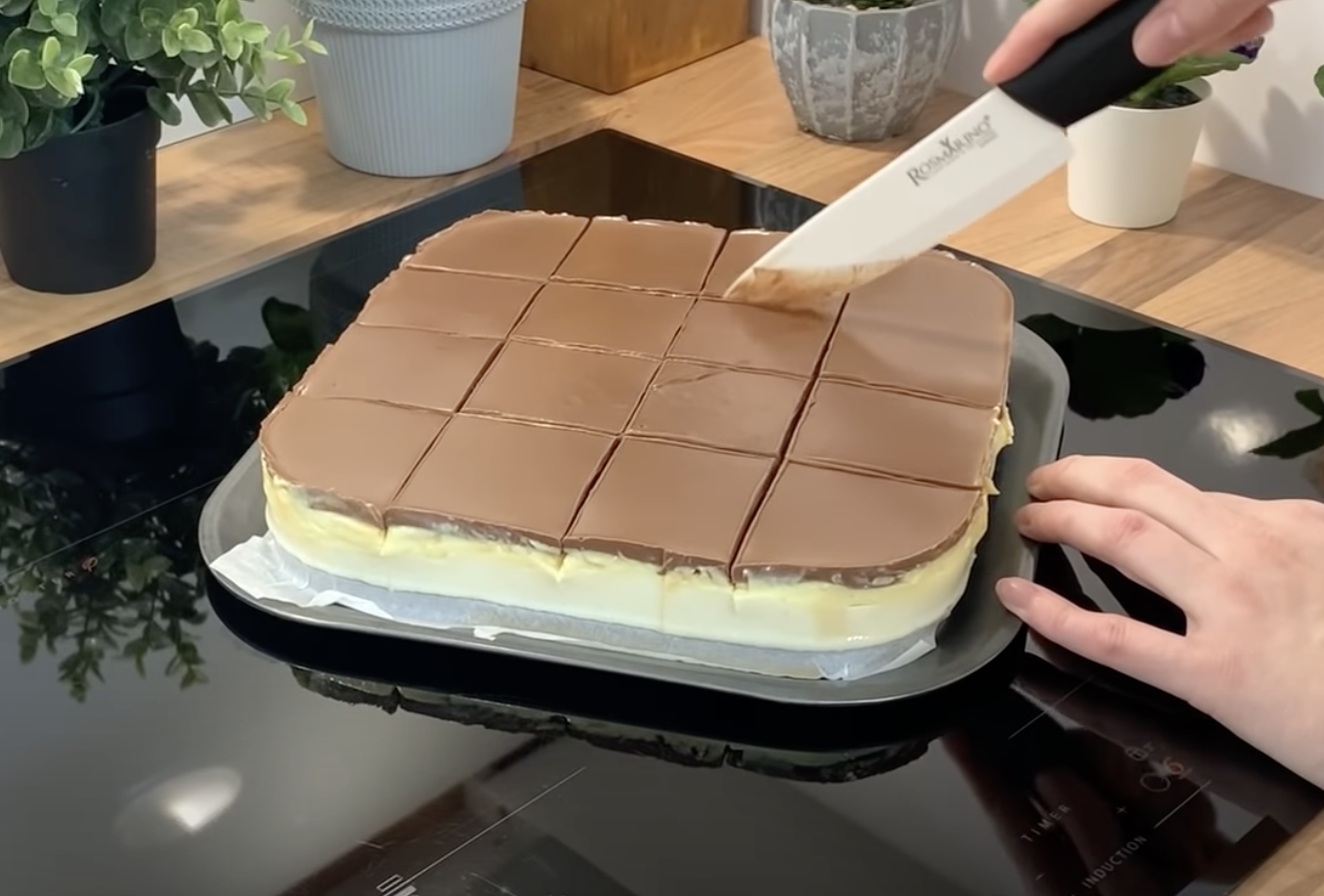 Drugą połowę kremówki lekko podgrzewaj z czekoladą aż do rozpuszczenia. Polewa na ciasto gotowa.