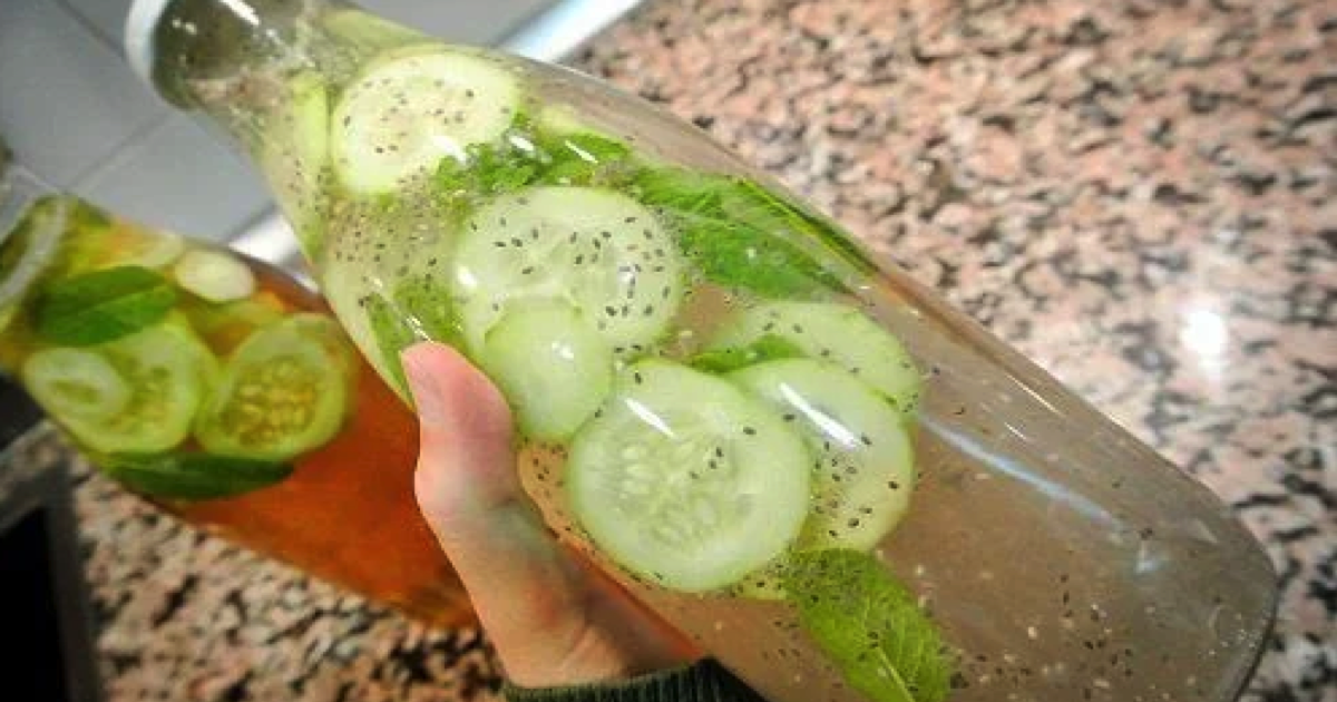 Imbir zetrzyj na tarce, ogórek obierz i pokrój, a cytrynę potnij na plasterki. Wszystkie składniki przełóż do butelki lub dużego dzbanka i zalej wodą.