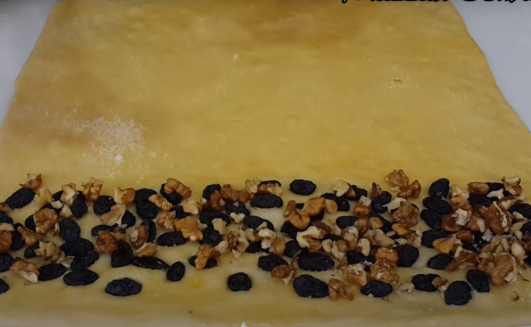 Następnie wykładamy ciasto na blat, kroimy na dwie części, rozwałkowujemy i przykrywamy folią spożywczą. Zakwasić przez kolejne 10-15 minut. Na posypanej mąką desce rozwałkowujemy ciasto o wymiarach 35 x 30 cm, które smarujemy roztopionym masłem, posypujemy cukrem krystalicznym, rodzynkami i orzechami.