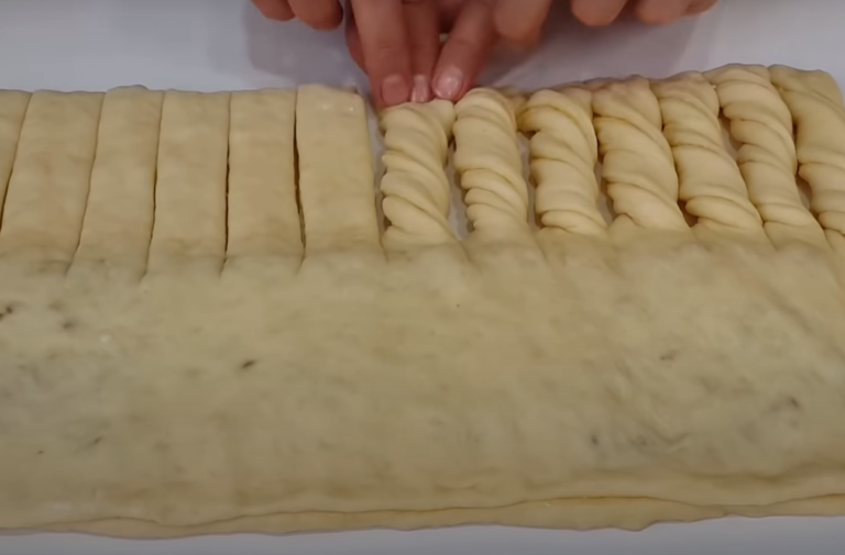 Ciasto złożyć na pół, docisnąć palcami i pokroić na równe części w paski, w której nie ma nadzienia. Skręcamy każdy pasek, a następnie zwijamy wszystko w jedną rolkę.