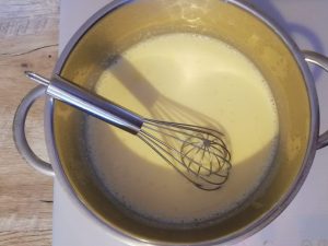 Najpierw robimy budyń z mleka, cukru, cukru waniliowego i proszku budyniowego. Pozwól mu ostygnąć. Ubij 1 łyżkę miodu i 1 łyżkę stołową cukru pudru i stopniowo dodawaj do niego łyżki budyniu.