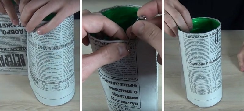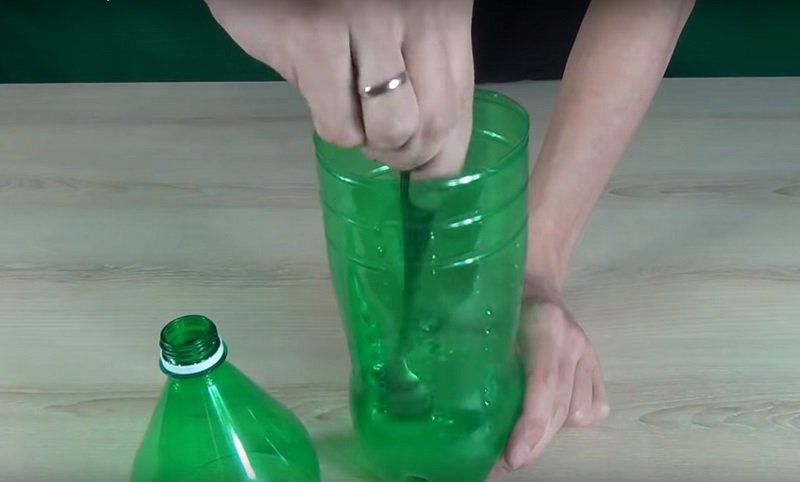 Umieścić stożkowatą część butelki, węższym końcem do środka pozostałej części. Jeśli części słabo trzymają się siebie nawzajem to trzeba użyć taśmy lub kleju.