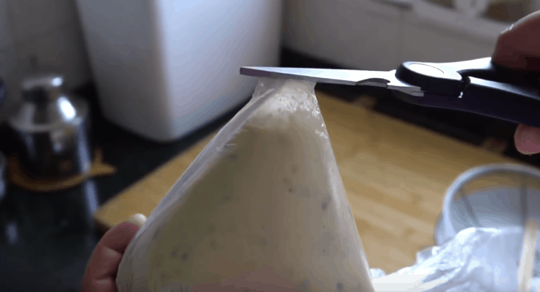 Przygotuj woreczek foliowy. Całą masę przełóż do woreczka, jeden jego róg odetnij i płynnymi ruchami wyciskaj pojedyncze porcje masy do rozgrzanego oleju.
