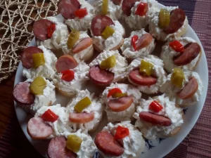 Pastę posolić do smaku i wstawić na krótko do lodówki. Widelcem rozsmarowujemy puszystą pastę na plastrach bułek lub na wieczkach, w które wbijamy kiełbasę, kawałek sera, kulki wina gronowego do smaku… lub po prostu dekorujemy posiekaną natką pietruszki i podajemy.
