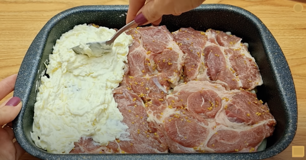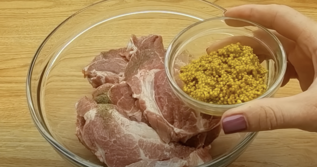 Mięso dopraw przyprawami, musztardą, rozmarynem oraz skrop olejem. Odstaw na 10 minut.