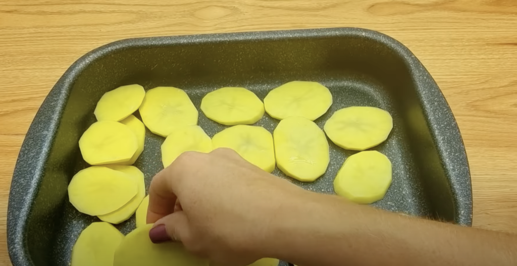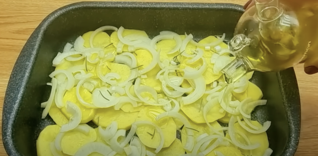Pokrój ziemniaki i cebulę w koła. Ułóż je na blaszce do pieczenia i skrop składniki olejem.