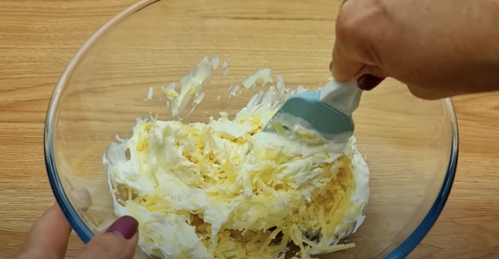 W drugiej misce wymieszaj śmietanę, jogurt i starty ser.