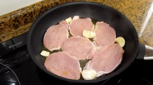 Następnie posolić i popieprzyć plastry mięsa, a także natrzeć przeciśniętym przez praskę czosnkiem. Następnie obierz cebulę i drobno posiekaj. Na koniec smażymy na odrobinie oleju słonecznikowego na złoty kolor.