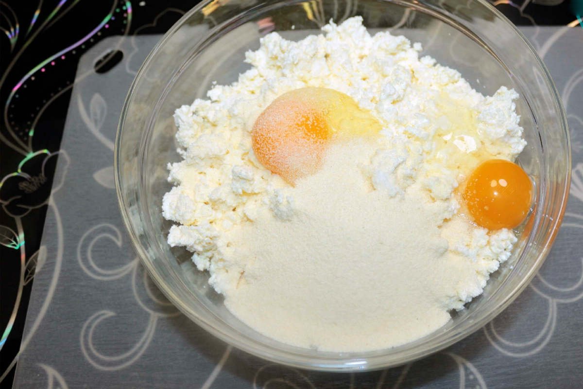 Gotowy twaróg przełóż do miski o dużej głębokości i wymieszaj wraz z jajkiem/jajkami, cukrem, cukrem waniliowym oraz kaszą manną. Masę odstaw na czas około 5-10 minut.