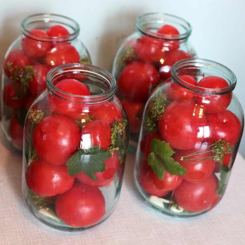 Każdy pomidor nakłuj kilka razy cienką wykałaczką tak aby przebić skórkę (blisko miejsca w którym był ogonek) i ułóż je ciasno w słoikach uważając alby przesadnie ich nie zgnieść. W przerwy między pomidorami powkładaj ząbki czosnku (średnio jeden ząbek na jeden słoik), po jednym sporym liściu chrzanu, kopru i pietruszki.