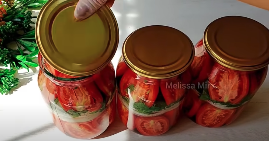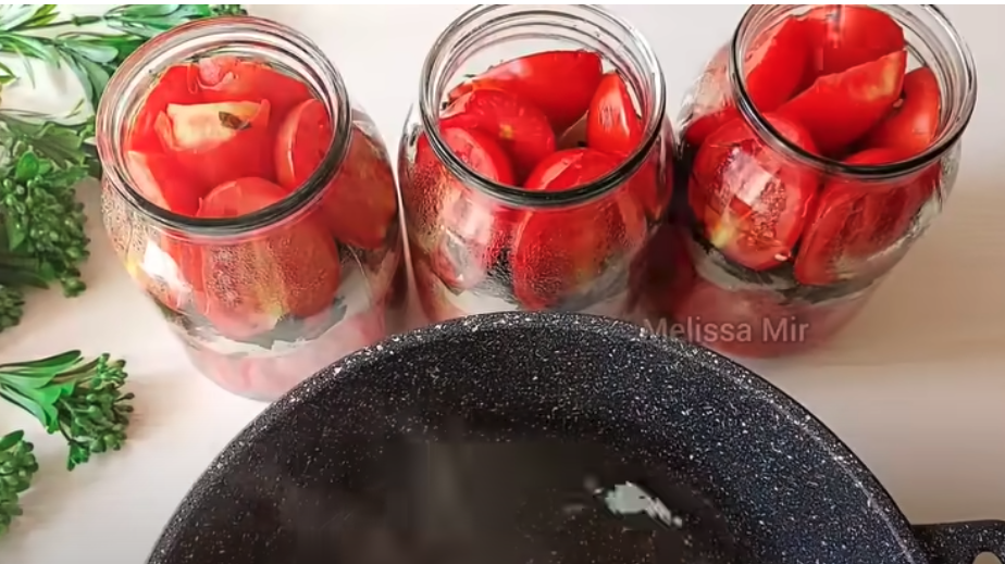 Umyj i osusz dokładnie słoik oraz pokrywkę. Upewnij się, że są czyste i suche. Pokrój pomidora, cebulę i ostre papryczki na mniejsze kawałki. Umieść warzywa w słoiku, dodając listki mięty i czarny pieprz do smaku. Zalej warzywa wrzącą wodą, pozostawiając miejsce na górze słoika. Pozostaw na 10 minut, aby warzywa dobrze się namoczyły.
