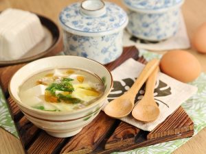 Ugotowane jajko należy obrać ze skorupki i przekroić na dwie części, a następnie uformować małe kostki z tofu. Do talerza możesz teraz wlać zupę, dodać serek i jajko.
