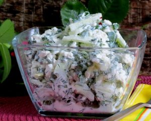 Należy dokładnie posiekać wszystkie produkty lub zetrzeć je na tarce. Połączyć z twarogiem, doprawiając sokiem z cytryny, miodem i jogurtem.