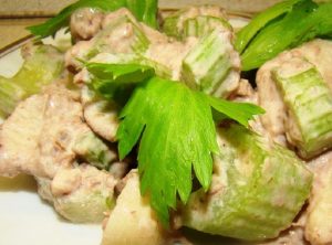 Tuńczyka należy rozgnieść widelcem. Seler naciowy wymieszać, dodając oliwę z oliwek, sok z cytryny i pieprz.