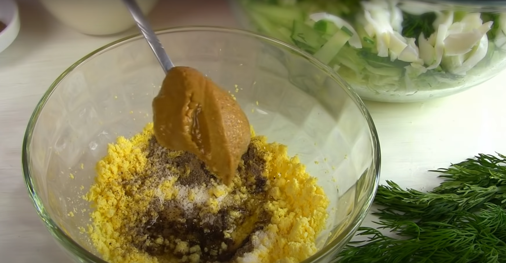 Pokrój kapustę i ogórka jak w pierwszym przepisie na cienkie paski. Następnie dodaj posiekaną kolendrę i koperek. Jajka ugotuj na twardo, oddziel białka i żółtka. Białka pokrój na małe kawałki, a żółtka rozgnieć widelcem.