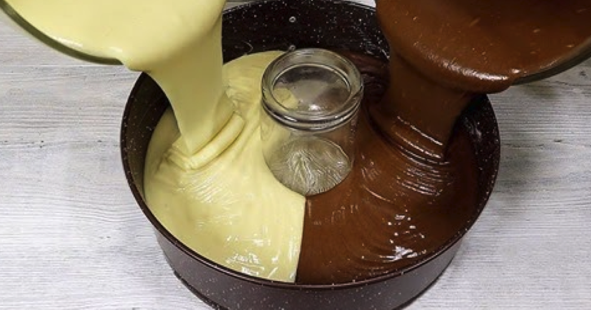Obie masy przelewaj równomiernie, aby uzyskać dwukolorowe ciasto.