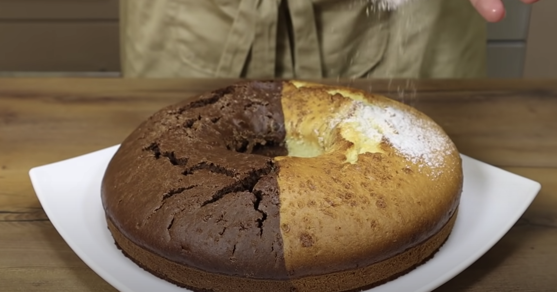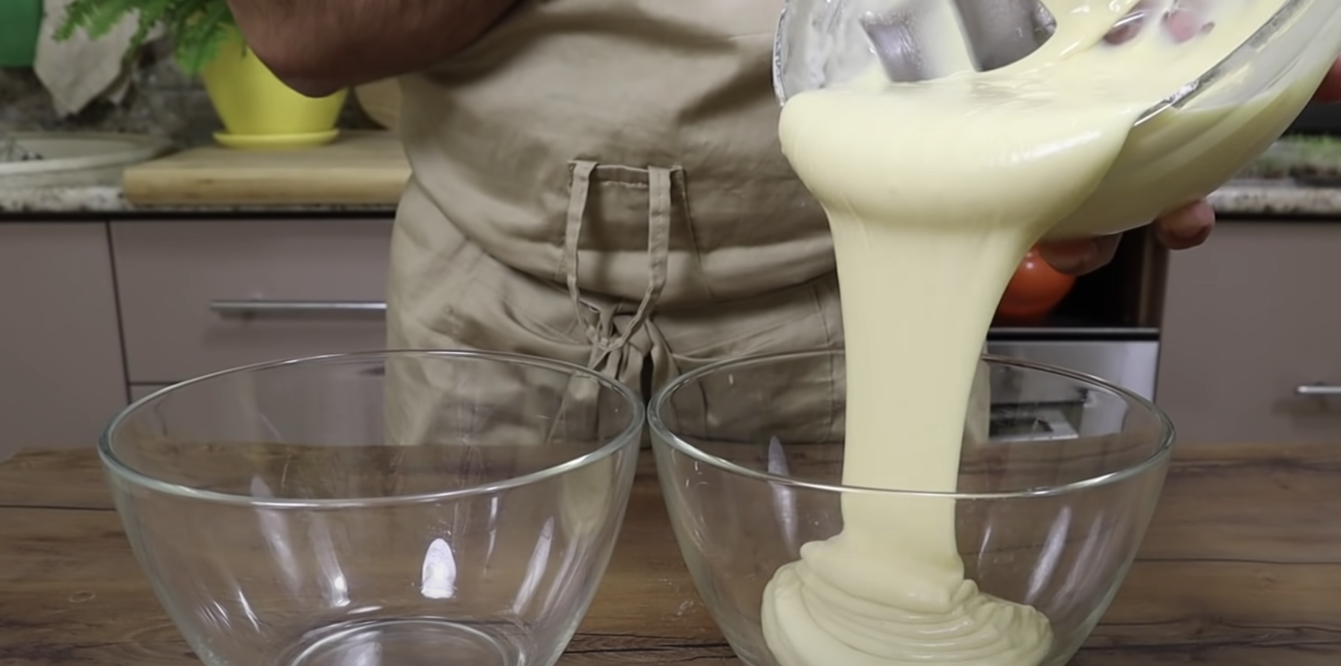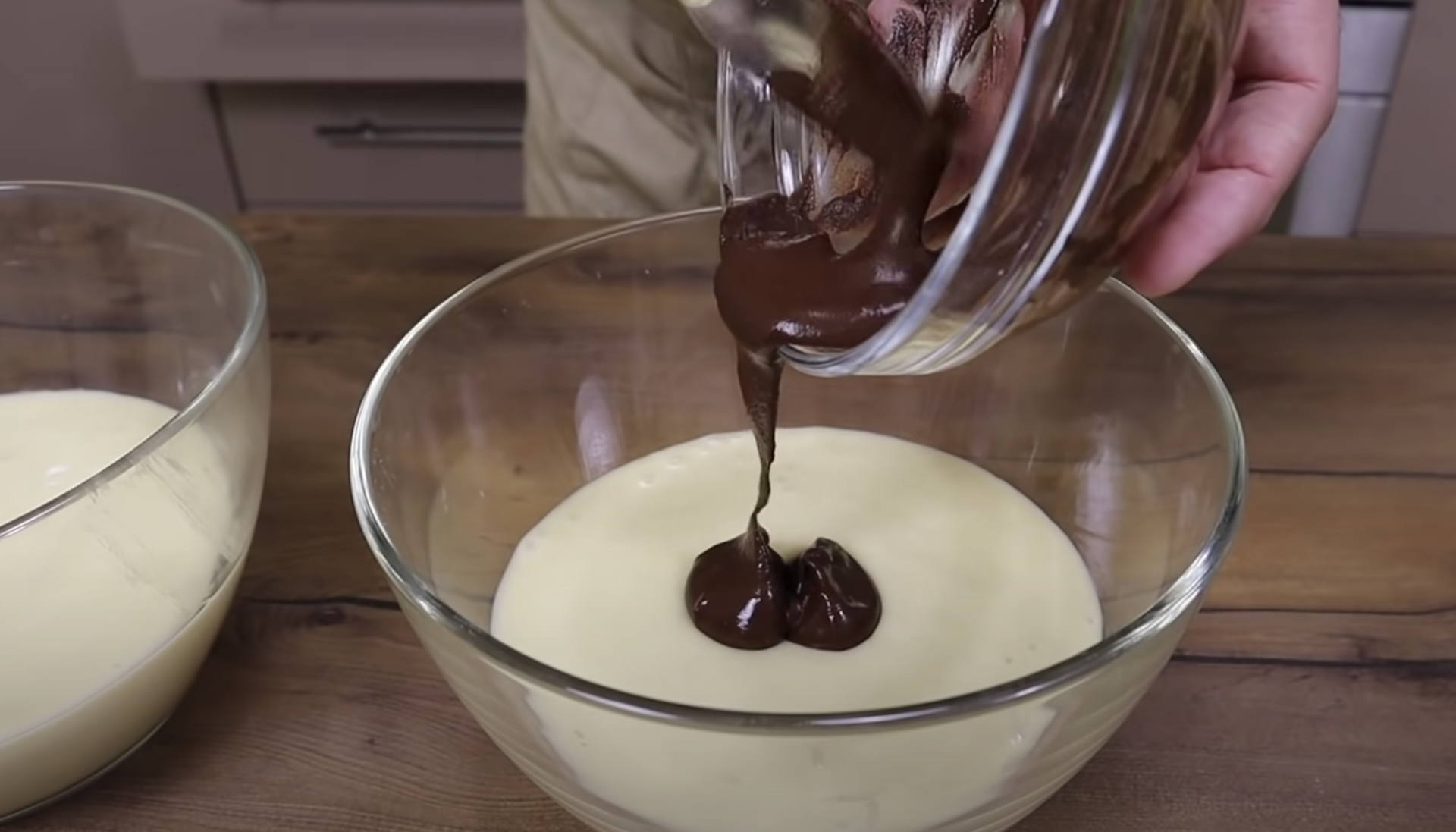 Obie masy przelewaj równomiernie, aby uzyskać dwukolorowe ciasto.