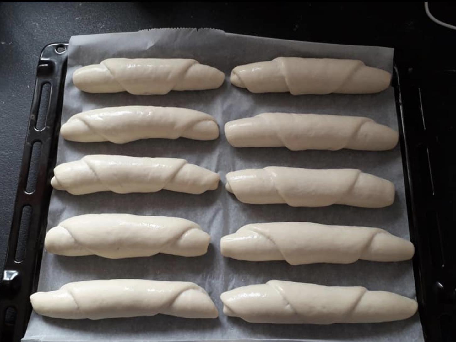 Zwinięte rogale należy ułożyć na pergaminie, przykryć folią i pozostawić na 40 minut, żeby wyrosły. Po tym czasie włożyć je do nagrzanego do 250 stopni piekarnika, na którego dnie umieścić trzeba płaskie naczynie z wodą.